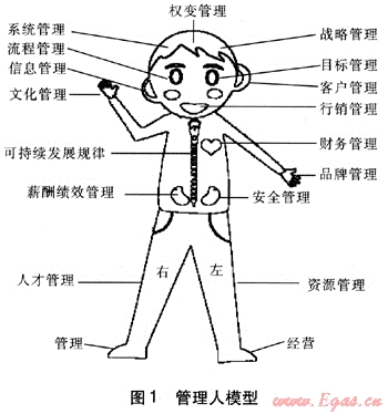 現(xiàn)代市場經(jīng)濟下的企業(yè)管理,就是帶有知識經(jīng)濟、網(wǎng)絡經(jīng)濟、信息經(jīng)濟色彩的企業(yè)管理,就是對技術、信息的把握,帶有中西方文化大融合特色對人的管理。各種管理理論都是管理學家站在不同角度,用不同語言解讀企業(yè)可持續(xù)發(fā)展規(guī)律的不同層次。而管理人模型(見圖1)就是以人為模板,按照人的幾大系統(tǒng)相互協(xié)作,以人的大腦指揮著兩只腳向目標前進為基礎。確立“一個腦袋兩只腳”的管理人模型,就是具有戰(zhàn)略思維的“大腦”,指揮著圍繞市場活動的“經(jīng)營左腳”,圍繞企業(yè)內部的“管理右腳”,帶動企業(yè)這個法人不停地向前走。
