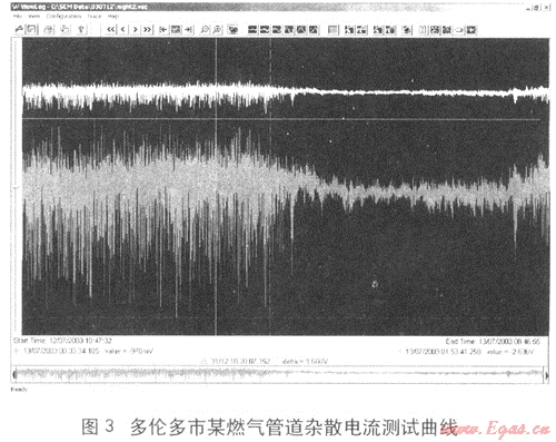美國腐蝕工程師學(xué)會(NACE)在2004年發(fā)布了一篇報告《對影響管道的雜散電流的一種測試技術(shù)》,報告中提出可以采用SCM測試儀等方法對影響管道的雜散電流進行測試,并以加拿大多倫多市的一條燃氣管線的測試數(shù)據(jù)為例進行分析,詳見圖3。測試數(shù)據(jù)顯示,燃氣管道受到雜散電流干擾,報告中分析干擾信號與附近電氣化鐵路的運行有關(guān),應(yīng)該是來源于鐵路的運行。