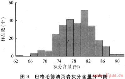 共分析油頁巖灰分樣品88個,灰分含量分布范圍為63.1%~83.9%.,平均值為74.8%,主要集中在74%~84%之間,屬于中灰分油頁巖(圖3)。