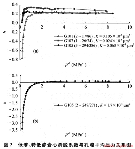 由此可知,低滲巖心氣體滲流過程中滑脫效應(yīng)并不是一定存在,而且滑脫系數(shù)也并不是一個(gè)常數(shù),在低孔隙壓力條件下,滑脫系數(shù)可以認(rèn)為是一個(gè)常數(shù),但是隨孔隙壓力增加,滑脫系數(shù)開始減??;而且滲透率越大,滑脫系數(shù)越小,滑脫效應(yīng)越不明顯;對(duì)于特低滲巖心,滑脫系數(shù)明顯偏大,而且在高孔隙壓力下滑脫系數(shù)雖有所減小,但是變化不是太大,一般不會(huì)變?yōu)樨?fù)值。說(shuō)明氣體滑脫效應(yīng)確實(shí)主要發(fā)生在低孔隙壓力下的低滲透巖石中。較高滲透巖石中雖然也存在滑脫效應(yīng),但是隨壓力增加,滑脫效應(yīng)迅速減小直至可以忽略。