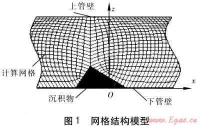 研究模型采用二維四邊形網(wǎng)格結(jié)構(gòu)模型,模擬的輸氣管道直徑與長度之比為1:6,沉積物在三方向的高度與管徑之比為3:10,煤層氣輸氣管道的豎直軸截面處在xOz平面內(nèi),x軸與下管壁重合,原點(diǎn)取在模擬段下管壁的中心位置上,見圖1,用三角形模擬沉積物。