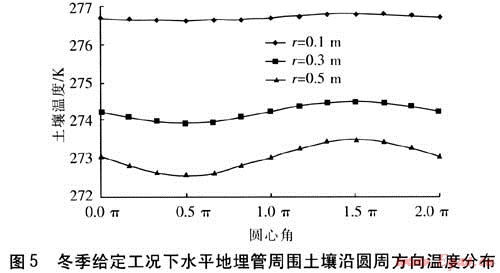 由圖5可知:①土壤溫度沿圓周方向呈正弦曲線分布,每個圓周上溫度最高點(曲線波峰)都是出現(xiàn)在原平面的1.5π方向,即圓周最底端;溫度最低點(曲線波谷)出現(xiàn)在原平面的0.5π方向,即圓周最頂端。②圓周方向上的土壤溫度呈正弦曲線分布,但每個圓周上的土壤平均溫度不同,即土壤溫度沿3條正弦曲線都在自己的中心線附近變化。這是由于隨著圓周遠離地埋管,土壤溫度逐漸降低,r=0.1m圓周上的土壤平均溫度要高于r=0.3、0.5m圓周上的土壤平均溫度。③圓周方向上的土壤溫度呈正弦曲線分布,但每個圓周上的土壤溫度變化幅度各不相同,即溫度曲線的振幅不同。r=0.1m的曲線振幅最小,r=0.5m的曲線振幅最大,即距地埋管中心越近的圓周,其上土壤溫度變化程度越?。痪嗟芈窆苤行脑竭h的圓周,其上土壤溫度變化程度越大。這是由于地埋管上方的土壤隨著位置越遠離地埋管越易受到大氣低溫的影響,因此地埋管上方的土壤隨著位置遠離地埋管,溫度逐漸降低,而且這種降低的速度越來越快。而地埋管下方的土壤隨著位置越遠離地埋管受大氣低溫的影響越小,這部分土壤由于遠離地埋管溫度也逐漸降低。但由于深度加大受大氣低溫影響減小,這種降低的速度卻是越來越慢的。這就導(dǎo)致在距地埋管距離越遠的圓周上,土壤溫度差距越大,即同一圓周上土壤的溫度變化越劇烈,變化的范圍越大。