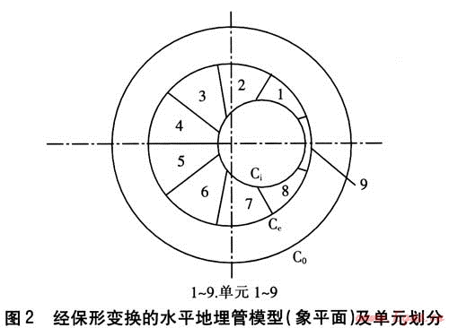 以水平地埋管換熱器土壤源熱泵為研究對象,建立水平地埋管的二維數(shù)學模型,該模型屬于圓柱理論模型。水平地埋管模型(原平面)及測點布置見圖1。采用邊界離散法對水平地埋管換熱器的熱力狀況進行分析,通過保形變換(見圖2)、分離變量及區(qū)域銜接得到了溫度場的級數(shù)解。在確定級數(shù)各項系數(shù)時,對于正交部分,采用傳統(tǒng)的Fourier方法;對于非正交部分,采取積分邊界元的方法[3~5]。模型軟件采用VB編制,計算水平地埋管及其周圍壤溫度場、熱流量分布、單位管長換熱量。
