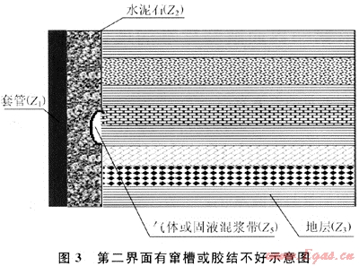 如圖3所示,當?shù)诙缑婺z結(jié)質(zhì)量較差時,與前面對第一界面膠結(jié)不好的分析類似,水泥環(huán)與地層之間存在第三介質(zhì),第三介質(zhì)一般反映為氣體、液體或固液混漿。