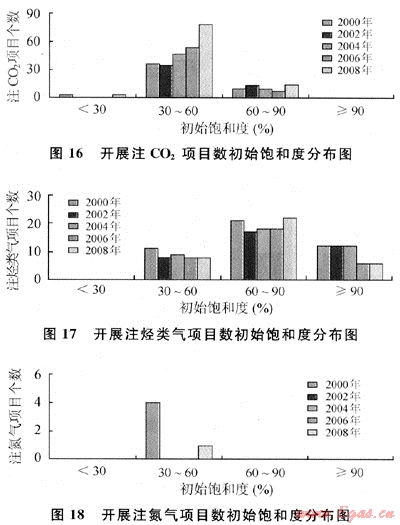 從圖16~18中可以看出,近10a來世界范圍內實施的注氣項目中,采用CO2,驅及氮氣驅的油藏初始飽和度取值范圍為30%~60%,注烴類氣為30%~90%。