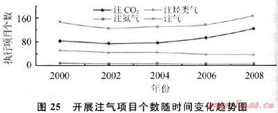 目前,我國CO2排放量居世界第二位,并且還在增長[13]。預測表明,到2025年,我國CO2排放總量很可能超過美國,居世界第一位。由圖25可以看出:近10a來,世界注氣特別是注CO。提高采收率技術(EOR)項目逐年增加,已成為世界范圍內提高原油產(chǎn)量的重要手段之一。CO2在幾種氣體中混相壓力最低,效果最好,氣源最豐富,發(fā)展注CO2驅油將是我國的方向。
