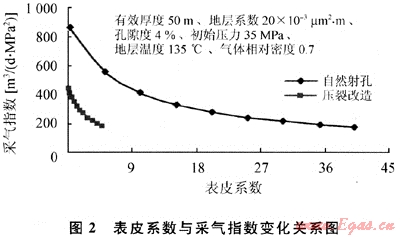 為了描述表皮系數(shù)對產能的影響,以表皮系數(shù)為0作參照,分別模擬了自然產能井與壓裂井在不同表皮系數(shù)下采氣指數(shù)的變化。壓裂井模擬采用壓裂井+均質條帶型儲層模型,儲層寬度為200m,裂縫半長為30m;自然產能井,模型為連續(xù)型儲層,日產量8×104m3、開井時間30d。
