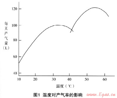 沼氣是有機(jī)物質(zhì)在一定溫度、濕度、pH值和隔絕空氣條件下經(jīng)微生物發(fā)酵而產(chǎn)生的可燃性氣體。影響發(fā)酵過程的因素很多,其中發(fā)酵溫度尤為重要。在我國農(nóng)村,沼氣池發(fā)酵溫度隨氣溫的變化而變化,沼氣產(chǎn)氣率變化很大。試驗(yàn)表明:池溫低于10℃,發(fā)酵菌幾乎處在休眠狀態(tài),沼氣池基本停止產(chǎn)氣;當(dāng)池溫在15℃以上時(shí),沼氣發(fā)酵才能較好地進(jìn)行,產(chǎn)氣率為0.1m3/(m3·d)-0.2m3/(m3·d);池溫在20℃以上時(shí),產(chǎn)氣率可達(dá)0.4m3/(m3·d)-0.5m3/(m3·d)。圖1是沼氣發(fā)酵溫度對產(chǎn)氣率的影響曲線[3]。