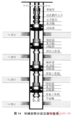 對于氣層多而薄,非均質(zhì)性強的儲層:采用了分層壓裂改造的儲層改造思路,實現(xiàn)了不動管柱一次分壓4層的技術(shù)突破(圖14)。通過114口探井的應(yīng)用,平均試氣產(chǎn)量提高3.74×104m3/d,已成為蘇里格氣田勘探開發(fā)的主體技術(shù)之一。