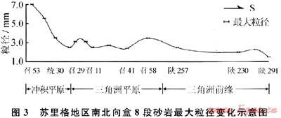 蘇里格地區(qū)主體處于三角洲平原、三角洲前緣沉積相帶。 中二疊世石盒子期盒8時,北部物源區(qū)進一步隆升[7],為盆地沉積提供了豐富的碎屑物質(zhì),古氣候由潮濕轉(zhuǎn)為半干旱干旱,受氣候季節(jié)性、周期性變化影響,湖平面頻繁波動,在平坦地形的情況下,湖岸線擺動大而且迅速,三角洲平原上的分流河道通過湖面的頻繁波動向湖泊中心方向長距離推進,形成高建設(shè)型河流三角洲沉積,且導(dǎo)致不同期次的河道橫向反復(fù)遷移,砂體縱向上多期疊置,平面上連片分布,主力氣層盒8段形成延伸范圍達數(shù)百千米大面積分布的砂巖儲集體。砂巖粒度總體表現(xiàn)為北粗南細、以中-粗粒為主的特征,北部沖積平原相砂巖最大粒徑達7.0mm,向南延伸的三角洲前緣相仍發(fā)育粗粒相砂巖,砂巖的最大粒徑達2.0mm(圖3)。