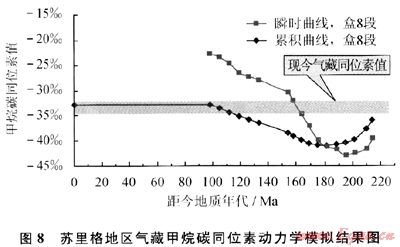 氣藏同位素動力學(xué)模擬實驗結(jié)果表明,累積甲烷碳同位素值曲線與現(xiàn)今氣藏同位素值范圍基本一致,同樣說明蘇里格地區(qū)天然氣藏主要為近源捕獲,并且是長期累積聚氣所形成的(圖8)。