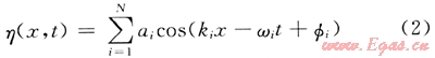 式中η(x,t)表示x處的水面相對(duì)于靜水面在t時(shí)刻的高度,m;ai為第i個(gè)組成波的波幅,m;ki表示t時(shí)刻在這個(gè)水面高度的波的數(shù)量,就是第i個(gè)組成波的數(shù)量;ωi表示第i個(gè)組成波的圓頻率,1/s;φi表示第i個(gè)組成波的初始相位,(°)。