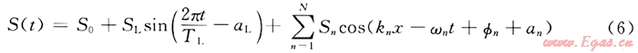 使用描述波浪的郎格-赫金斯(Longuet-Higgins)模型,波浪可由若干個(gè)不同周期、不同波高、不同相位角的簡(jiǎn)單余弦波進(jìn)行線(xiàn)性疊加來(lái)模擬。長(zhǎng)峰波浪可以表示為: