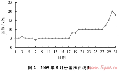 試驗裝置連續(xù)平穩(wěn)運行前4個月,進出口差壓變化很小,一直在5kPa以內(nèi),每天平均排放液體約80kg。2009年5月19日起試驗裝置進出口差壓開始增高,5月30日達到20kPa,差壓曲線圖如圖2所示,已超出15kPa的設(shè)計監(jiān)控值,但還沒影響到壓縮機的正常運行。2009年6月5日更換了試驗裝置中的4#凈化器的濾料,經(jīng)分析,試驗裝置進出口壓差突然增高的原因是高效氣體(深層)過濾器內(nèi)的中空纖維濾料吸收液態(tài)雜質(zhì)達到飽和所致。
