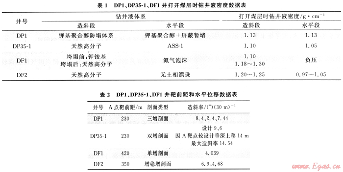 6) 調(diào)整了A點靶前距,有效降低DF2井鉆遇煤層段長。造成DF1井兩次埋鉆事故原因主要有以下幾個方面:①打開煤層時鉆井液密度不足以平衡煤層的垮塌應力(表1為DP1井、DP35-1、DF1打開煤層時鉆井液密度數(shù)據(jù));②DF1造斜段煤層垮塌時采用倒裝鉆具組合,滑動鉆進后變復合鉆進時,由于鉆具撓動敲打,誘發(fā)煤層大量坍塌,造成突然坍塌埋鉆;③DF1井為長半徑水平井,A點靶前位移大,造斜率小,穿越煤層段長,累計煤層厚43m,單層最大厚度為25m(表2為DP1井、DP35-1、DF1、DF2井造斜段造斜率數(shù)據(jù))。