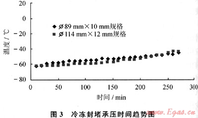 由試驗(yàn)結(jié)果可知:利用保溫夾套將冷凍介質(zhì)與外界環(huán)境隔離,有效降低了冷凍介質(zhì)與外部環(huán)境的熱交換;管道內(nèi)的固水乳化劑冷凍后,實(shí)驗(yàn)管道在承受氣壓2.5MPa的情況下,維持氣壓不降的時(shí)間約為5h,遠(yuǎn)大于Φ89mm×10mm、Φ114mm×12mm管道的圓周焊接時(shí)間,可以用于工程施工。