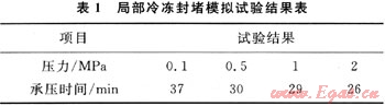 管道局部封堵的原理是通過向管道中放入具有一定強(qiáng)度的封堵物,利用其與管道壁面之間的摩擦力或結(jié)合力來實(shí)現(xiàn)局部封堵,皮囊封堵與機(jī)械封堵均屬于這一范疇。局部冷凍封堵通常是將管道中可凍結(jié)的流體冷凍,通過冷凍段來承受壓力,起到隔離的作用。小管徑天然氣管道要采用冷凍封堵,必須先注入可凍結(jié)流體(常用的可凍結(jié)流體是水),再進(jìn)行冷凍。為了驗(yàn)證水變成冰后自身的承壓能力以及與管壁的結(jié)合力能否承受較高的氣壓,筆者在Φ60mm×8mm的試驗(yàn)管道內(nèi)密封一段長(zhǎng)100mm水柱,將試驗(yàn)管道放于冰柜中進(jìn)行冷凍,使水凍成冰,再在室溫(15℃)下加氣壓,進(jìn)行局部冷凍封堵模擬試驗(yàn),試驗(yàn)結(jié)果見表1。