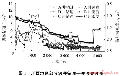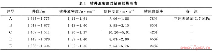 通過統(tǒng)計分析川西地區(qū)5口深井實鉆資料,認(rèn)為以下鉆井液因素對鉆速存在影響。