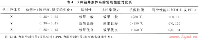 在綜合調(diào)研國內(nèi)外深井鉆井液體系的基礎(chǔ)上,結(jié)合川西地區(qū)深井的工程地質(zhì)特征及鉆井液的現(xiàn)場應(yīng)用情況,選擇在川西地區(qū)應(yīng)用比較成功的X、Y和Z等3種鉆井液體系進(jìn)行室內(nèi)評價,根據(jù)配方進(jìn)行配制的鉆井液,對其流變性、抑制性、潤滑性及抗溫、抗鹽膏能力進(jìn)行了系統(tǒng)的評價(表4)。結(jié)果表明,3種鉆井液體系具有各自的特點和適用范圍,X鉆井液屬于不分散鉆井液體系,對提高鉆井速度很有幫助,但是其在耐溫性和固相容量限兩個方面存在問題。當(dāng)?shù)貙訙囟瘸^80℃時,X鉆井液體系的性能開始惡化,穩(wěn)定性變差,失水量增加;而當(dāng)鉆井液密度過高時,由于受到X鉆井液容量限的限制,鉆井液性能會整體變差。因此,X鉆井液體系只適應(yīng)于淺井段的鉆井。