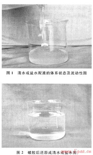 無(wú)(低)滲漏完井液主要由有機(jī)高分子吸水材料膠凝劑、絡(luò)合淡水中二價(jià)陽(yáng)離子的螯合劑、調(diào)節(jié)流變性的穩(wěn)定劑組成。基本配方為:淡水+0.5%螯合劑YF-1+1%~2%膠凝劑SW-1+0.5%穩(wěn)定劑WDJ-1。完井液由毫米級(jí)的軟顆粒組成,顆粒尺寸分布在0.5~3mm,軟顆粒易變形,有一定強(qiáng)度,該完井液體系用酸液能完全破膠,并能還原成清水(圖1、2)。