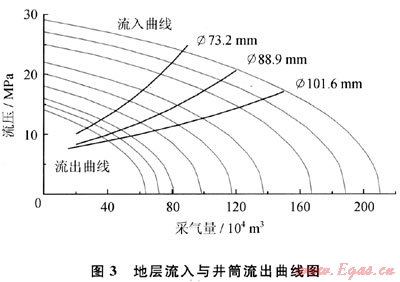單井采注氣能力的大小,受地層滲流能力和井筒流動能力兩方面因素影響,只有當?shù)貙恿魅肽芰εc井筒流出能力協(xié)調(diào)一致時,也即在流入流出曲線圖(圖3)中曲線交匯處氣井的生產(chǎn)能力才是最高的。