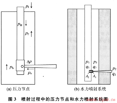 水力噴射逐層壓裂工藝不使用封隔器,就可以實現(xiàn)多層壓裂。其所依賴的機理就是在噴嘴出口處形成的負壓導引流體轉向,只進入射孔孔道中而不會進入到已經壓開的層段。因此,環(huán)空壓力的控制是關鍵(圖3-b)。