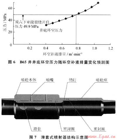 如圖6所示,在設計865井須六上亞段水力噴射壓裂時,當環(huán)空補液排量達到0.7m3/min,井底環(huán)空壓力就超過已經壓裂的須六下亞段的裂縫開啟壓力,因此須六上亞段的環(huán)空補液排量的上限就是0.7m3/min。
