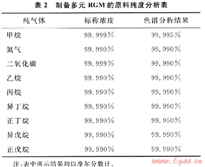 高純度起始組分(原料氣)中的雜質(zhì)分析是制備高準(zhǔn)確度RGM的另一個(gè)必須解決的關(guān)鍵技術(shù)。此類(lèi)測(cè)定準(zhǔn)確度要求很高的原料氣純度分析研究工作不可能由生產(chǎn)廠家完成。根據(jù)GB/T 5274附錄A有關(guān)原料氣純度的論述表明,表2所示的原料氣純度數(shù)據(jù)在尚未作進(jìn)一步分析驗(yàn)證前,它們不能應(yīng)用于制備擴(kuò)展不確定度為0.5%(包括表中所列9個(gè)組分的)多元RGM的原料氣,甚至也不能應(yīng)用于制備擴(kuò)展不確定度為1%的多元RGM。