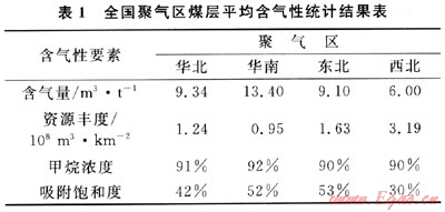 從地域分布分析,煤層平均含氣量以華南聚氣區(qū)為最高,其次為東北聚氣區(qū)和華北聚氣區(qū),西北聚氣區(qū)最低;各區(qū)的甲烷濃度較為接近,由高到低依次為華南、華北、西北和東北聚氣區(qū);各聚氣區(qū)的平均資源豐度相差比較懸殊,西北聚氣區(qū)顯著高于其他地區(qū),其次為東北聚氣區(qū),華北略低于東北,華南最低;平均吸附飽和度以東北聚氣區(qū)為最高,華南次之,再為華北,西北最低(表1)。