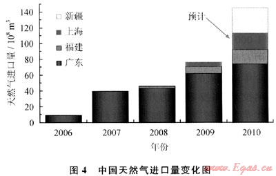 進(jìn)口液化天然氣(LNG)正在幫助緩解因需求迅速上升給國(guó)內(nèi)市場(chǎng)供應(yīng)帶來(lái)的壓力。自2006年5月26日國(guó)內(nèi)第一船進(jìn)口6×104t澳大利亞液化天然氣運(yùn)抵深圳大鵬灣以來(lái),國(guó)內(nèi)進(jìn)口液化天然氣設(shè)施已發(fā)展到3座,分布在廣東深圳、福建莆田和上海洋山,規(guī)模分別為370×104t/a、260×104t/a和300×104t/a。2009年液化天然氣進(jìn)口量已由2006年的69×104t猛增到553×104t(76×108m3)(圖4)。進(jìn)口液化天然氣以用作發(fā)電和工業(yè)燃料為主,也有一部分進(jìn)入城市天然氣管道,滿足民用燃?xì)庑枨?。隨著上海洋山進(jìn)口設(shè)施轉(zhuǎn)入正常運(yùn)轉(zhuǎn),并保障上海世博會(huì)期間的燃?xì)夤?yīng),中海油3座進(jìn)口設(shè)施2010年的進(jìn)口量可能會(huì)輕易超過(guò)800×104t。今后兩三年內(nèi),當(dāng)中石油江蘇如東和遼寧大連以及中海油浙江寧波共3座在建進(jìn)口設(shè)施建成投產(chǎn)時(shí),液化天然氣年進(jìn)口規(guī)模將由現(xiàn)在的930×104t擴(kuò)大到1880×104t。中海油預(yù)計(jì)到2020年僅該公司就將擁有5000×104t/a進(jìn)口液化天然氣接收能力。