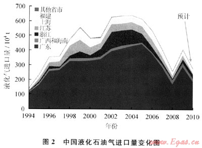 珠江三角洲和長(zhǎng)江三角洲是進(jìn)口液化氣的消費(fèi)中心(圖2)。廣東省是國(guó)內(nèi)最大的進(jìn)口液化氣市場(chǎng)。在過(guò)去5年里,廣東省進(jìn)口量一直占全國(guó)的70%左右。不過(guò),價(jià)格高漲和經(jīng)濟(jì)滑坡引起的需求下降導(dǎo)致廣東省進(jìn)口量從最高時(shí)2005年的447×104t降低到2009年的178×104t。在這幾年里,國(guó)內(nèi)第一座年進(jìn)口370×104t液化天然氣(LNG)設(shè)施2006年5月在深圳建成投產(chǎn)以及比鄰的海南省800×104t/a新建煉油廠同年6月投產(chǎn)也給廣東省進(jìn)口液化氣市場(chǎng)帶來(lái)沖擊。不過(guò),外向型的經(jīng)濟(jì)特征和分布廣泛的加工企業(yè)決定了廣東省對(duì)優(yōu)質(zhì)進(jìn)口液化氣的堅(jiān)實(shí)需求。2009年廣東省進(jìn)口量上升到296×104t,將近2/3的升幅明顯高于全國(guó)平均水平。