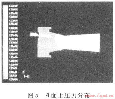 圖5為引射器A面上壓力分布。為了很好地顯示引射器內(nèi)部壓力狀況,著重體現(xiàn)了5Pa以下的壓力分布。在吸氣收縮管內(nèi)壓力接近于0Pa,與外界壓力相當。經(jīng)過喉部,在擴壓管部分壓力逐漸平穩(wěn)增加,而且每個橫斷面上的壓力分布非常均勻。最終在擴壓管出口壓力達到5Pa,以克服氣流在燃燒器頭部的阻力。
