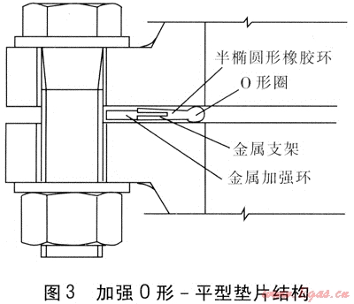 第3種結(jié)構(gòu)為加強0形-平型墊片,將上述第2種結(jié)構(gòu)的金屬骨架取消,在外側(cè)加裝金屬加強環(huán),見圖3。這種結(jié)構(gòu)的墊片由橡膠半橢圓形橡膠環(huán)、O形橡膠圈、金屬支架、金屬加強環(huán)組成,金屬支架與金屬加強環(huán)為一個整體,半橢圓形橡膠環(huán)與O形橡膠圈為一個整體,O形橡膠圈的直徑為半橢圓形橡膠環(huán)厚度的1.2~1.5倍。金屬加強環(huán)的厚度為半橢圓形橡膠環(huán)厚度的0.7倍。半橢圓形橡膠環(huán)外側(cè)的凹槽與金屬支架承插連接。推薦在4.0MPa設(shè)計壓力下使用這種結(jié)構(gòu)形式的墊片。
