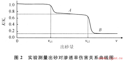 淺層氣藏地層容易出砂,在近井地層形成堆積并堵塞孔喉,造成近井地帶滲透率降低。圖2為實驗室?guī)r心實驗測量的出砂對滲透率傷害關系曲線。在巖石發(fā)生坍塌破壞之前,地層中游離砂產(chǎn)生的微粒運移傷害,造成儲層的相對滲透率降低了25%左右(圖2中A點)。隨著氣體流速的增加,受剪切應力的作用儲層骨架遭到破壞,近井地帶大量出砂。在游離砂和骨架砂的復合作用下,儲層的相對滲透率降低至儲層原始滲透率的20%左右(圖2中B點)[3~4]。