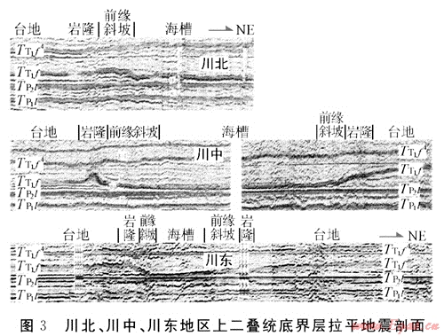 地震相是以反射波的頻率、振幅、相位、時(shí)差及反射外形等屬性來(lái)反映地層物性變化的。通過(guò)地震相研究表明,在眾多地震屬性中,反射振幅、層間時(shí)差和反射外形結(jié)構(gòu)(如平行、上超、下超、前積等)是識(shí)別四川盆地臺(tái)地-海槽沉積相的區(qū)域橫向變化較為實(shí)用的幾個(gè)屬性標(biāo)志。