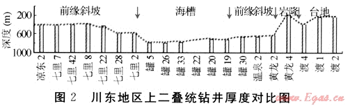 由于沉積環(huán)境不同,淺水臺(tái)地沉積速率大于深水海槽,其臺(tái)地沉積厚度明顯厚于海槽沉積存度;而在臺(tái)緣帶上,由于前積作用及各種海洋生物大量堆積所形成的碳酸鹽巖,使地層厚度增大。圖2是橫穿川東“開(kāi)江-梁平”海槽相帶的上二疊統(tǒng)鉆井厚度對(duì)比直方圖,它直觀地反映出臺(tái)地厚度朝海槽方向變薄的區(qū)域前積沉積現(xiàn)象。