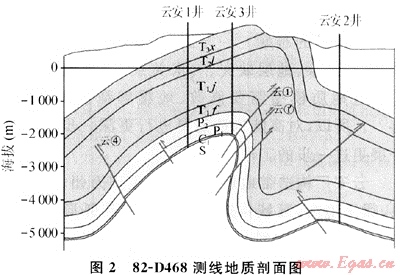 在鉆后地質(zhì)剖面上(圖4),可清晰地看出,該井鉆遇構(gòu)造復(fù)雜帶,飛仙關(guān)出現(xiàn)地層倒轉(zhuǎn)現(xiàn)象,地層倒轉(zhuǎn)點在海拔-2150m附近,嘉四段地層恢復(fù)正常(-3400m左右)地層程序,該井下方為低洼部位,已無鉆達(dá)潛伏構(gòu)造的可能,而其剖面右側(cè)的“斷壘”部位為馮家灣潛伏構(gòu)造的東傾末端。