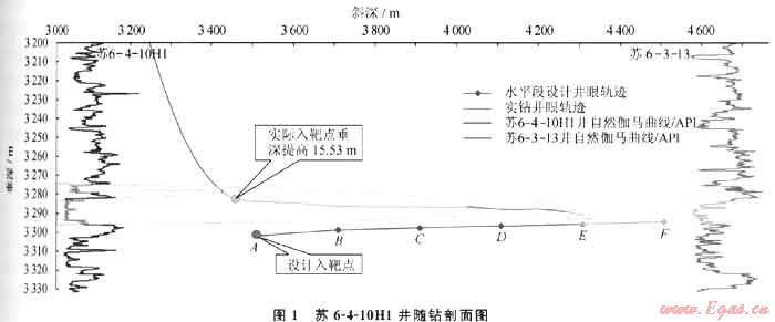如果設(shè)計(jì)靶點(diǎn)低于實(shí)際目標(biāo)層,在有效地層厚度范圍內(nèi)井斜角達(dá)不到工程入靶技術(shù)要求,則存在鉆刻目標(biāo)層、填井重鉆風(fēng)險(xiǎn)。典型井蘇6-4-10H1,設(shè)計(jì)靶點(diǎn)在預(yù)測目標(biāo)層以下15.53m,發(fā)現(xiàn)后及時(shí)上調(diào)入靶點(diǎn),最終使該井成功入靶(圖1)。