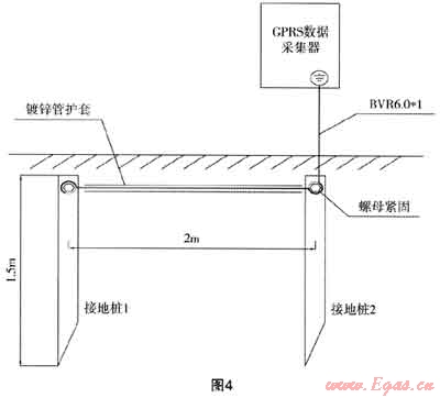 (3) 接地是通過金屬導線與接地裝置連接,將電氣設備和其他生產設備上可能產生的漏電流、靜電荷以及雷電電流等引入地下。遠程抄表系統(tǒng)主要有兩種接地,一是防雷接地,二是屏蔽接地。防雷接地是將220V電源浪涌接地、24V電源浪涌接地、信號浪涌接地、流量計表頭感應電接地。屏蔽接地是將RS485信號線屏蔽接地,防止高頻信號或雜波信號干擾影響DTU正常工作。與建筑物共用防雷接地體接地電阻應小于1Ω;單獨使用鍍鋅角鋼打接地樁的接地電阻應小于4Ω。與接地體連接的接地線應使剛6mm2以上的BVR銅芯軟線或銅編織線。單根接地樁接地電阻達不到4Ω的,打接地樁應選擇土層厚實、雜物較少的地方。單獨打一根接地樁無法滿足接地電阻要求,則應再增加接地樁,直至滿足接地電阻要求。相鄰兩根接地樁之間的距離不應小于2m。接地樁之間應使用相同規(guī)格的角鋼焊接或使用6mm2以上的BVR銅芯軟線連接,并用螺絲緊固。其結構如圖4。