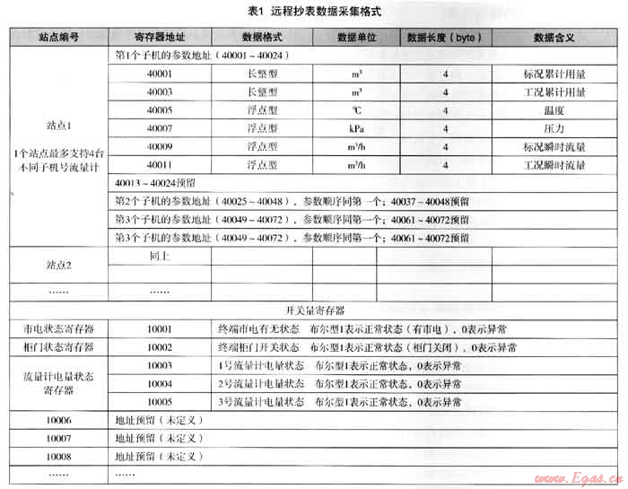 遠程抄表采集的數據有兩種類型,一種是計量表具數據,如流量、壓力、溫度等模擬量數據;另一種是狀態(tài)信號數據,如市電狀態(tài)、采集終端柜門狀態(tài)等開關量數據。數據采集格式見表1。