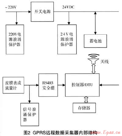 GPRS遠傳數據采集器是遠程抄表系統(tǒng)的重要設備,數據采集器具有RS485/232接口,通信速率為300~115200bps,通信協(xié)議采用MODBUS RTU/ASCⅡ工業(yè)通信協(xié)議,內部供電一般選擇24VDC。一只數據采集終端(DTU)實際應用中一般接1-3只燃氣表。標準GPRS遠程數據采集器內部結構如下: