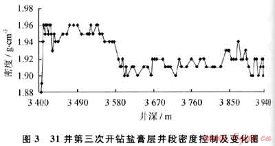 圖3所示為2010年3月31井在第三次開鉆鹽膏層井段(3400~3937m)的密度控制情況。31井第三次開鉆鹽膏層井段初鉆時密度控制在1.95g/cm3左右,進入井深3580m后根據實際情況逐步降低了鉆井液密度,合理、適當的調整密度范圍以達到“近平衡鉆井”,不僅給鉆井液日常維護帶來了便利,而且明顯提高了鉆井速度、縮短了鉆井周期(第三次開鉆鹽膏層用時僅30d),很好地實現了快速、安全、高效的鉆井目標。