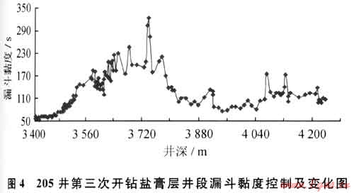 將“護膠為主、降黏為輔”作為調控各項性能的指導原則;適當降低井漿中的膨潤土含量,以降低其發(fā)生各種污染的可能性。高密度飽和鹽水鉆井液由于其密度高、固相含量大,體系本身所固有的固相容量限已被壓縮至一個很窄的范圍,一旦進入體系的劣質固相(如鉆屑粉末、泥巖細顆粒等)來不及清除,累積到一定程度若其超過體系固相容量上限時,各種固相粒子極易連接形成結構,導致鉆井液的黏度和切力增加,從而也會以污染形式表現出來[3~5]。如2009年3月205井在第三次開鉆鹽膏層井段(3402~4237m)鉆進過程中所發(fā)生的情況(圖4)就是如此,具體表現為鉆井液“黏土固相侵”,黏切劇增,流變性能失穩(wěn)。