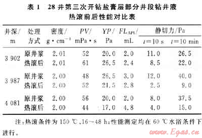 28井在第三次開鉆鹽膏層期間除采用高濃度(5%~8%)SMP和SMC三磺材料膠液外,性能維護時還不斷補充FT-1A、PAC等護膠劑進入體系。表1為28井第三次開鉆鹽膏層部分井段鉆井液在150℃熱滾前后性能變化對比表。不同井段鉆井液經過150℃熱滾后,鉆井液各項性能保持穩(wěn)定,甚至出現了性能越熱滾越好的現象。這是黏土高溫水化分散和處理劑護膠作用相互抵消和補償后的綜合結果;此現象同時也說明盡管黏土受到高溫水化分散后使其顆粒濃度相對增加,但由于鉆井液內有足量的護膠劑吸附在其顆粒上面,致使黏土顆粒之間不能發(fā)生“面-面”形式的聚結,從而穩(wěn)定了鉆井液的整體性能。