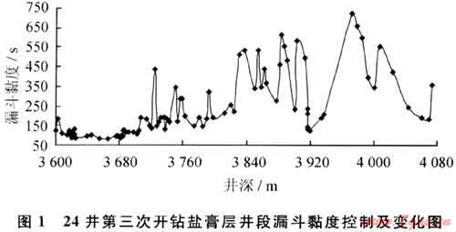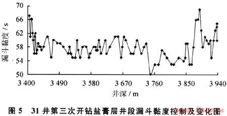 采取的具體措施包括:維持體系較低的堿性(即pH值一般保持在8~9);適當放大量以膠液形式補充各類處理劑進入體系以維護鉆進過程中材料的正常消耗;在井漿中不斷補充NaCl甚至到飽和以提高其整體抑制性;補充KCl至一定量以形成對黏土質成分應有的抑制效果等。圖5為31井第三次開鉆鹽膏層井段漏斗黏度控制及變化情況,由于加強了對鉆井液整體抑制性的維護,鉆井液流變性能明顯較好。