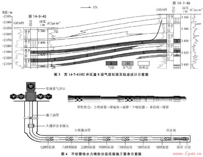 該技術(shù)通過高速水射流射開套管和地層并形成一定深度的噴孔,流體動能轉(zhuǎn)化為壓能,在噴孔附近產(chǎn)生水力裂縫,實現(xiàn)壓裂作業(yè)。該技術(shù)實現(xiàn)了射孔、壓裂、隔離一體化,具有適用多種完井方式(裸眼、套管、篩管)、不同儲層類型(砂巖、碳酸鹽巖)、井下管柱簡單、作業(yè)效率高等特點。2008年在長慶氣區(qū)第一口水平井壓裂試驗獲得成功,壓后增產(chǎn)5倍,堅定了蘇里格水平井開發(fā)試驗的信心,由此引領(lǐng)了水平井分段壓裂的強力攻關(guān)與試驗。但該技術(shù)在初期采用油管拖動水力噴射多段壓裂工藝,存在壓裂段數(shù)少、井控風險大等不足,2009年又創(chuàng)新提出了水力噴砂+多級滑套實現(xiàn)不動管柱多段壓裂的技術(shù)思路,形成了氣田不動管柱水力噴射分段壓裂技術(shù),實現(xiàn)了從Φ114.3mm套管一次壓裂3段到5段再到7段得跨越(圖4),并在Φ152.4mm裸眼實現(xiàn)一次壓裂10段得重大突破,2010年實施井平均壓裂7段,平均無阻流量達57.3×104m3/d,取得了較好效果。