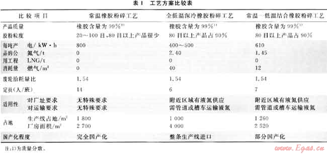 常溫橡膠粉碎工藝、全低溫深冷橡膠粉碎工藝和常溫和低溫相結合橡膠粉碎工藝的比較見表1[9]。