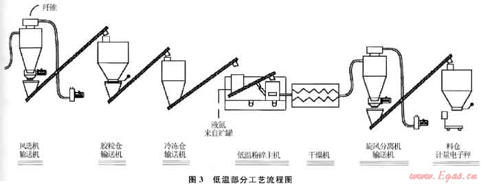 從常溫料倉出來的20~30目的常溫膠粉通過螺旋輸送機輸送到冷凍室進行冷凍。冷凍室由入口氣塞、出口氣塞和液氮控制系統(tǒng)組成。液氮將膠粉從常溫冷凍到玻璃化溫度,而冷凍室內的螺旋推進器可以推動膠粉通過冷凍室。冷凍室由不銹鋼內筒、電鍍外殼和中間絕緣部件組成,并安裝有橡膠涂層的傳動輪,使裝置能有效旋轉并保持磨損最小。經(jīng)冷凍室冷凍過的膠粉再由螺旋輸送機輸送到細碎機進行進一步的粉碎。細碎機的電機功率一般為50~150kW,帶有變頻驅動器,可以按要求粉碎出80目以上的膠粉產(chǎn)品。經(jīng)過細碎機細碎的膠粉通過螺旋輸送裝置輸送到干燥系統(tǒng)進行干燥,干燥系統(tǒng)配有熱風爐,由風機把加熱后的空氣送入干燥機對膠粉進行加熱,以此來去除膠粉中的水分,防止膠粉在輸送過程中出現(xiàn)結塊和堵塞現(xiàn)象。在干燥機的末端有1套分離系統(tǒng)負責不同粒度膠粉的分離,通過這套分離系統(tǒng)可以把大顆粒的膠粉分離出來送回冷凍室進行進一步的粉碎,分離后的合格固體膠粉進入細粉料倉進行稱重、包裝和成品入庫。該流程如圖3所示。