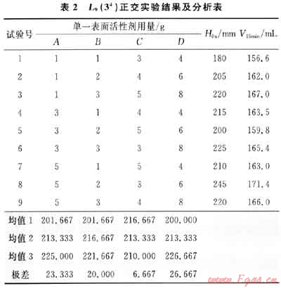 從表2可知,泡沫的攜液量都在150mL以上,其攜液能力(攜液能力=泡沫攜帶出的液體體積/總泡排劑溶液的體積×100%)[3]都在75%以上。因此,以起始泡高(0s)為考察指標(biāo)進(jìn)行分析,樣品L-2(D)是影響實(shí)驗(yàn)結(jié)果的最主要因素,單一表面活性劑L-1(A)。甜菜堿(B)和銨鹽(C)次之,最佳因素水平組合為A3B3C1D3。由于該配比不在原設(shè)計(jì)的試驗(yàn)方案中,為驗(yàn)證該配比的真實(shí)性,以該配比進(jìn)行起泡能力和攜液能力的測(cè)定,結(jié)果測(cè)得該配比的起始泡高度為265mm,攜液量為176.5mL。與表2中的8號(hào)試驗(yàn)結(jié)果相比,可證明該配比是9次試驗(yàn)中最優(yōu)的。因此通過(guò)正交設(shè)計(jì)實(shí)驗(yàn)確定泡排劑LYB-1的最佳質(zhì)量配比為L(zhǎng)-1(A):甜菜堿(B):銨鹽(C):L-2(D)=5:3:3:8。
