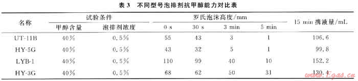 為了充分說(shuō)明泡排劑LYB-1具有較強(qiáng)的抗甲醇能力,30℃時(shí)將該泡排劑與現(xiàn)場(chǎng)應(yīng)用較多的泡排劑UT-118、HY-5G和HY-3G進(jìn)行了對(duì)比,試驗(yàn)結(jié)果見表3。表3數(shù)據(jù)表明,泡排劑LYB-1具有較強(qiáng)的抗甲醇能力,明顯優(yōu)于其他3種泡排劑。